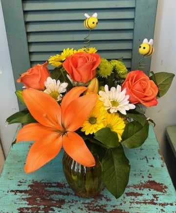 Celebrate the sweetness of spring with this cheerful arrangement bursting with color and charm. Designed in a sunny yellow vase, it features vibrant orange roses and a striking orange lily nestled among fresh seasonal greens. White and yellow daisies add a bright, happy touch, while two adorable bee accents bring a playful nod to the beauty of the season. Full of warmth and personality, this lively design feels like a little garden in bloom — perfect for brightening someone’s day, celebrating spring, or sending a buzz of happiness just because.
