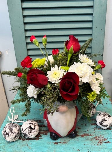 Gnome for the Holidays features a charming ceramic Santa gnome vase filled with festive Christmas greens, bold red roses, cheerful white daisies, and classic red and white carnations. This joyful arrangement is the perfect touch of holiday magic for any home, office, or gift giving.