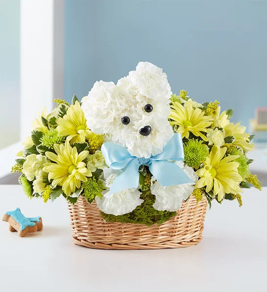 When it comes to new baby gifts, our truly original arrangement is the pick of the litter! Fresh white carnations are expertly crafted in the shape of an adorable dog, surrounded by a mix of fresh, colorful blooms and nestled inside a charming basket.