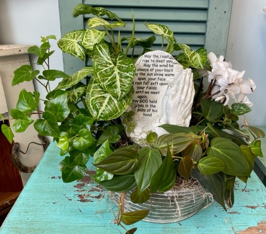 During difficult times, extend your sentiments to someone you care about. Palm of His Hand Dishgarden includes a Polyresin Inspirational Stone with Praying Hands surrounded by an array of green and blooming plants. The enduring vitality of these plants ensures a lasting tribute, preserving the legacy of a departed beloved. *Plants vary