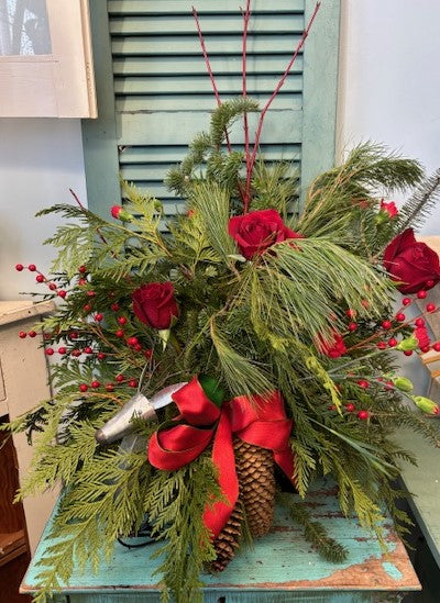 Reindeer Royale is a grand holiday centerpiece designed to make a statement. Featuring a trendy metal reindeer as its focal point, this arrangement is overflowing with fresh evergreen greens, artfully accented with pinecones, festive berries, and coordinating ribbon for a rich seasonal finish. The Standard version showcases the beauty of winter greens alone, creating an elegant and long-lasting display. The Deluxe and Premium designs elevate the look with fresh-cut seasonal flowers for added color, texture, and impact. Once the flowers have expired, they can be easily removed to continue enjoying the lush evergreen arrangement throughout the season. Perfect for holiday gatherings, formal dining tables, or as an impressive gift, Reindeer Royale brings timeless elegance and festive charm to any space.